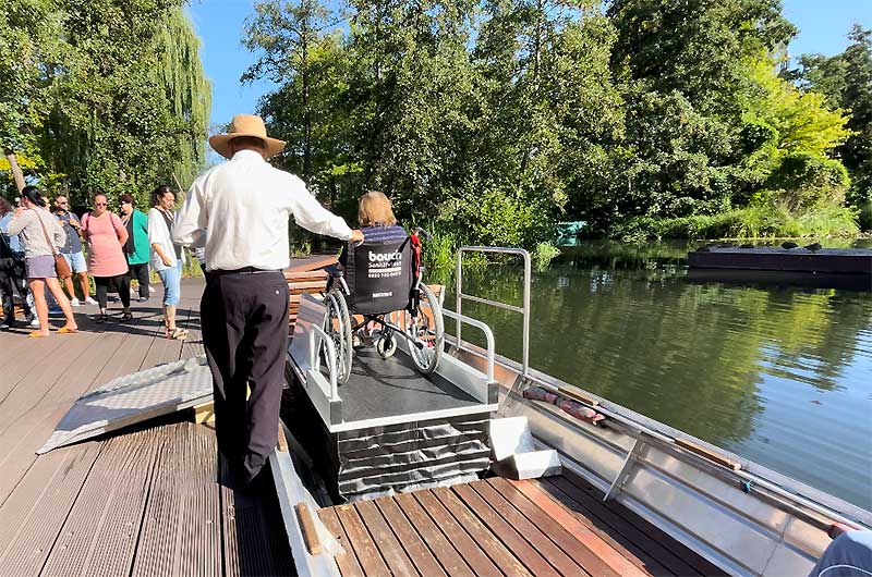 Der speziell angefertigte Kahn verfügt über eine Hebebühne. Über diese stabile Plattform können Rollstuhlfahrer und ihre Begleiter sicher ein- und aussteigen, ohne dabei auf Komfort und Sicherheit zu verzichten.